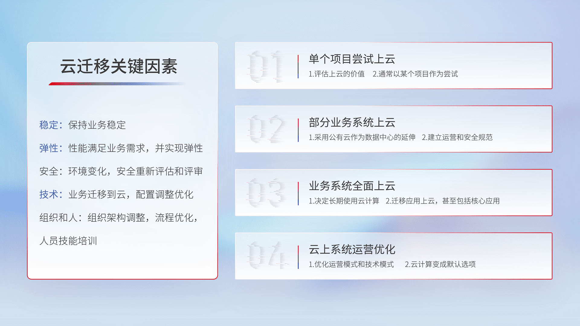 结合实际业务,,,,从规划设计、、、云平台选型、、、、云原生改造、、数据迁移、、集成交付,,迁移全过程为客户识别最佳上云路径,,,,做好风险识别管理,,,设计网络架构、、、、身份权限、、、安全审计合规、、操作审计、、、、日志审计、、监控告警策略、、、、多站点容灾设计等,,对云上基础设施进行整体规划,,,,提升IT治理水平,,,以满足弹性、、、、高可用、、、、高性能的需求。。