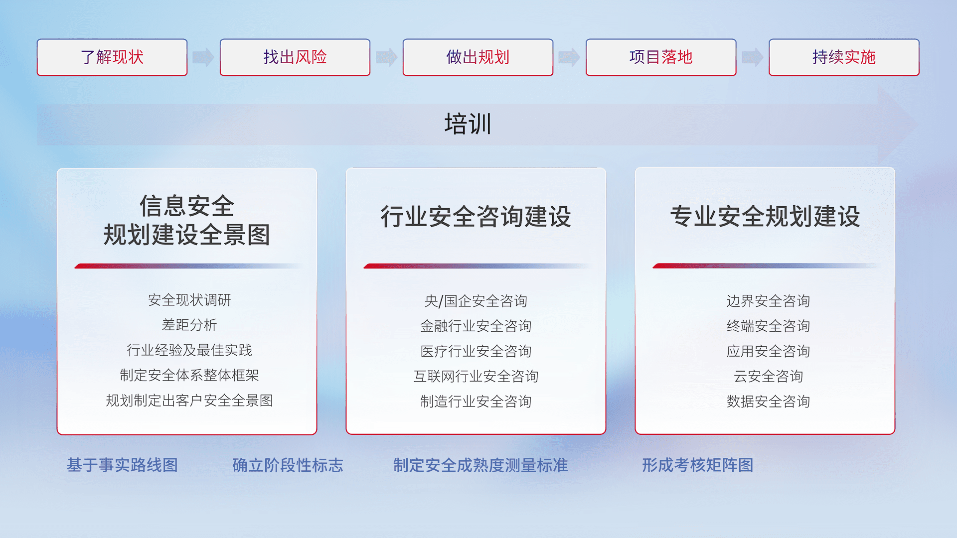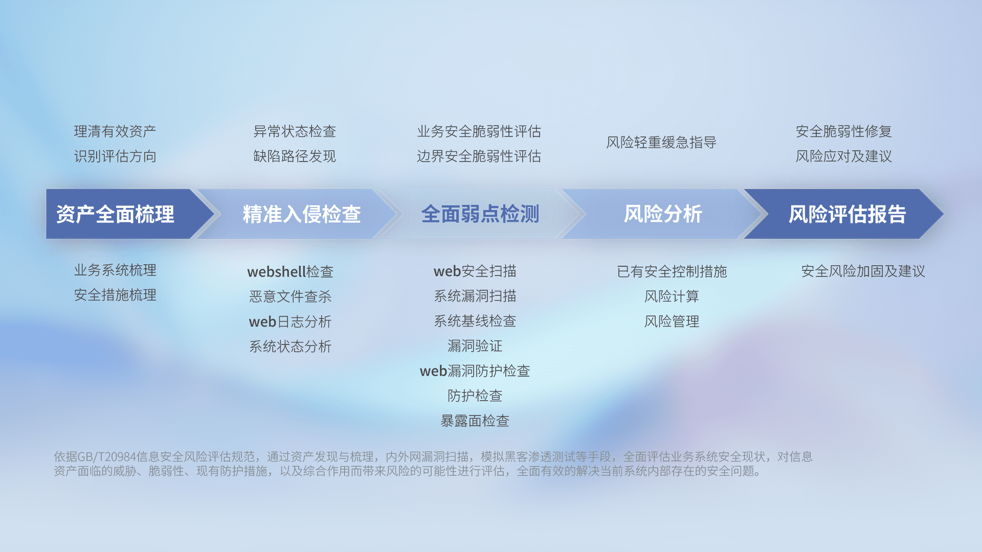 针对客户行业特性,,,,以专业的安全服务+多厂商联合解决方案提供专属的一站式安全管理服务,,帮助客户全面感知网络空间威胁,,基于识别、、、检测、、、分析、、、、防护、、、、监测、、、响应的服务理论模型,,,,从方案咨询、、、、集成交付、、评估验证、、、、优化加固、、运维运营,,,,致力于为客户提供完整的闭环管理式安全服务。。。。以实战经验为客户打造高抵御风险的安全体系,,帮助客户发现威胁、、、对抗威胁、、、处置威胁,,,,不断积累安全对抗能力,,持续保障数字化安全。。。。